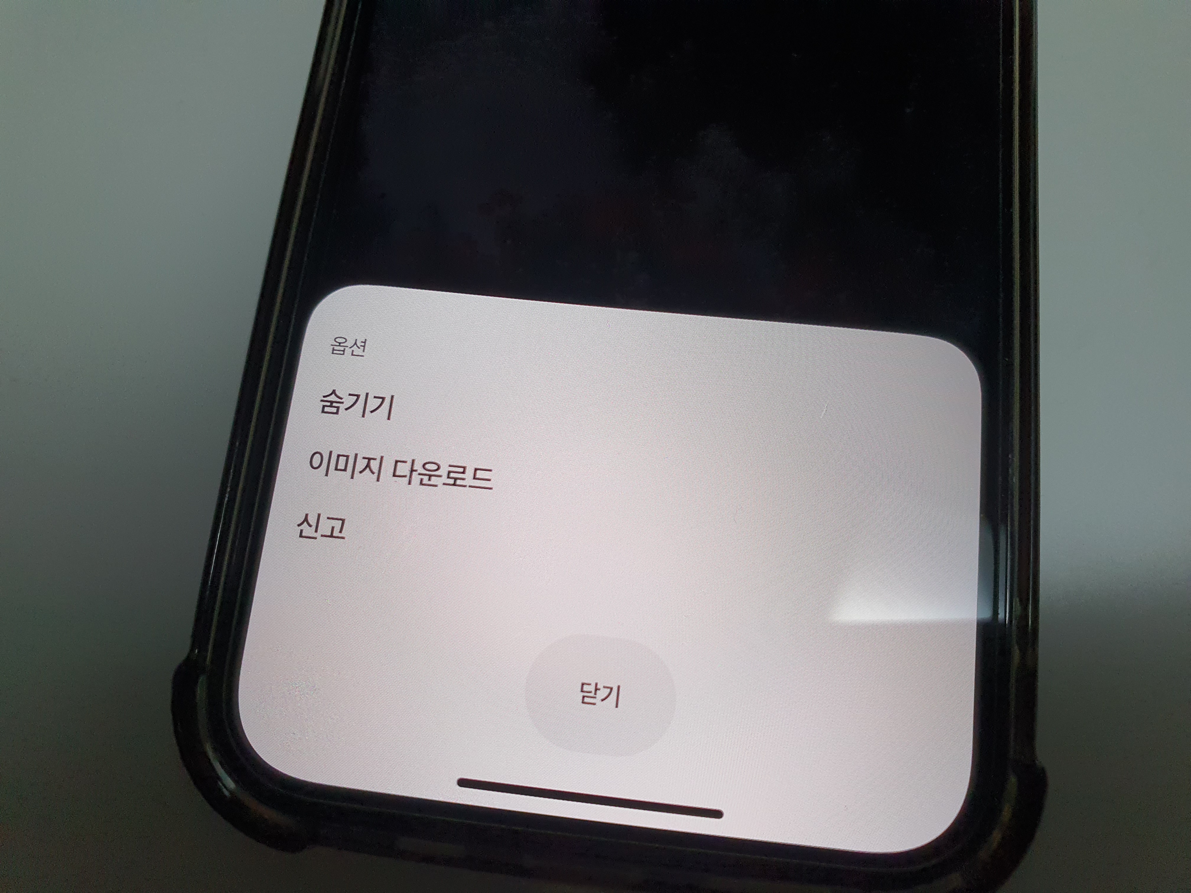 옵션으로 화면이 뜨면 제대로 따라와주신게 맞습니다. 다시 보고 싶지 않다면 '숨기기'를 해주시고, 부적절하다 싶으시면 '신고'를 해주시면 됩니다. 그리고 핀터레스트 사진 저장 하고 싶으시다면 이미지 다운로드를 터치해주시면 되는데요.